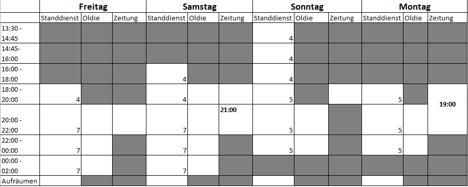 Gebt bei der Wahl der unterschiedlichen Prioritäten bitte nicht die gleichen Schichten an. Nur wer sich aktiv an der Kerb beteiligt, kann auch eine Getränkeflat kaufen.